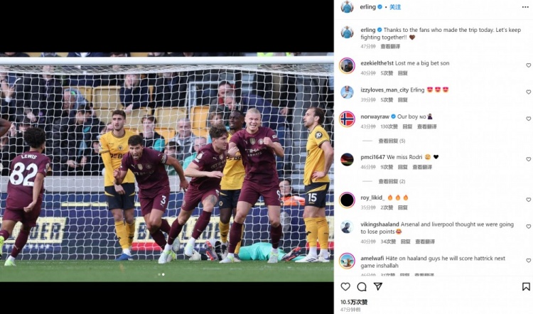 不过哈兰德还是通过社媒晒出自己和队友庆祝绝杀的照片,并配文:“感谢今天远征球迷的支持,让我们继续战斗