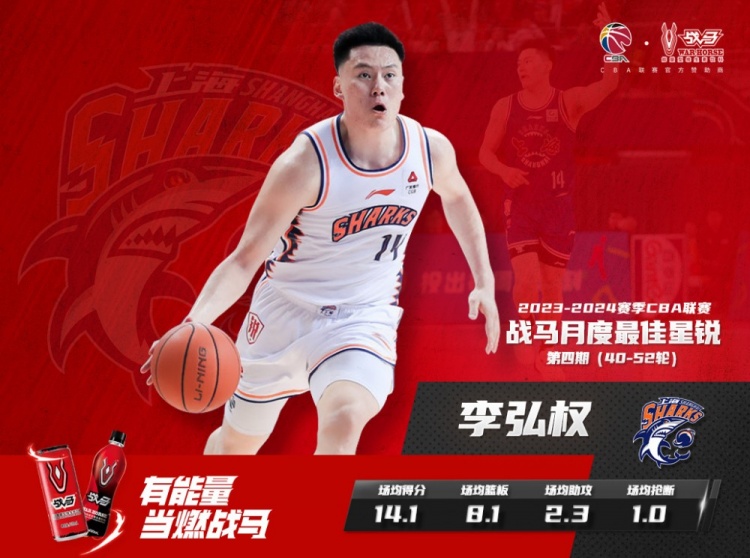恭喜上海久事大鲨鱼男篮球员李弘权荣膺2023-2024赛季CBA联赛第4期“战马月度最佳星锐球员”!
