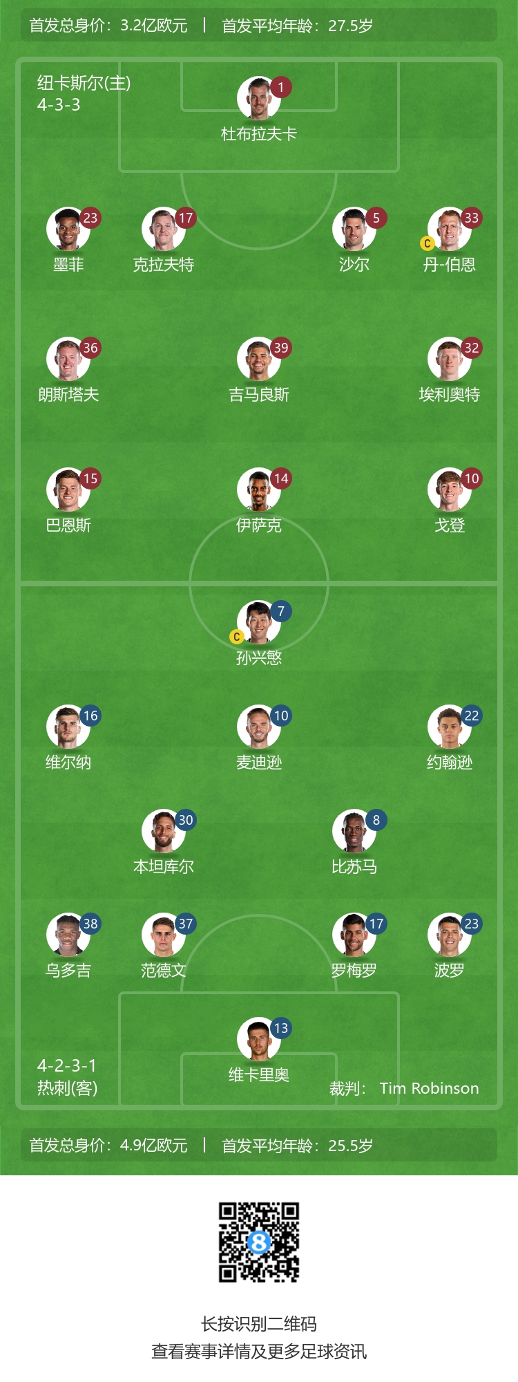 热刺首发:13-维卡里奥、17-C-罗梅罗、23-波罗、37-范德文、38-乌多吉、8-比苏马、10-麦迪逊、22-布伦南-约翰逊、30-本坦库尔、7-孙兴慜、16-维尔纳