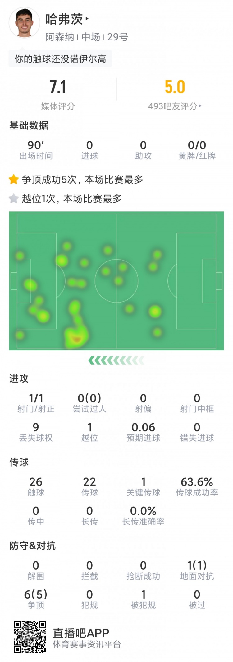 哈弗茨本场数据:1次射门,1关键传球,7对抗6成功,评分7.1分