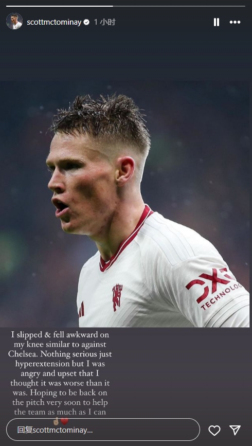 麦克托米奈:我当时滑倒了,膝盖很疼,就像对阵切尔西时一样。没什么大碍,只是膝关节过度伸展,但我当时很生气,也很难过,因为我以为情况比实际更糟。我希望能尽快回到球场,尽我所能帮助球队。