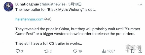 近日,一位准确爆料《黑神话:悟空(BLACK MYTH WU KONG)》将在5月19日公布的博主Lunatic Ignus再次发文透露了该作的最新情报,快来一起看下吧。