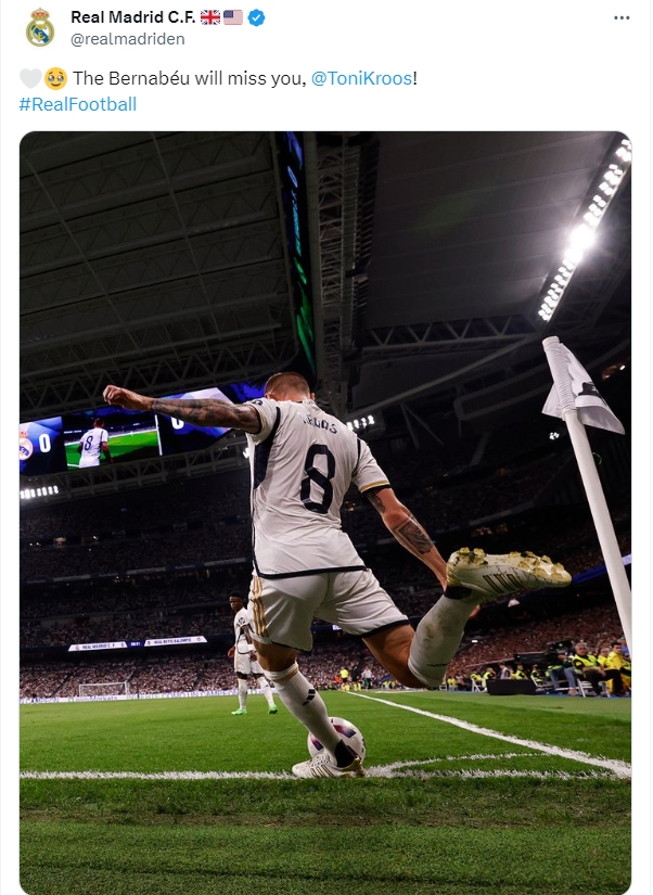 赛后,皇马官推发文祝福克罗斯:“伯纳乌会想你的。”