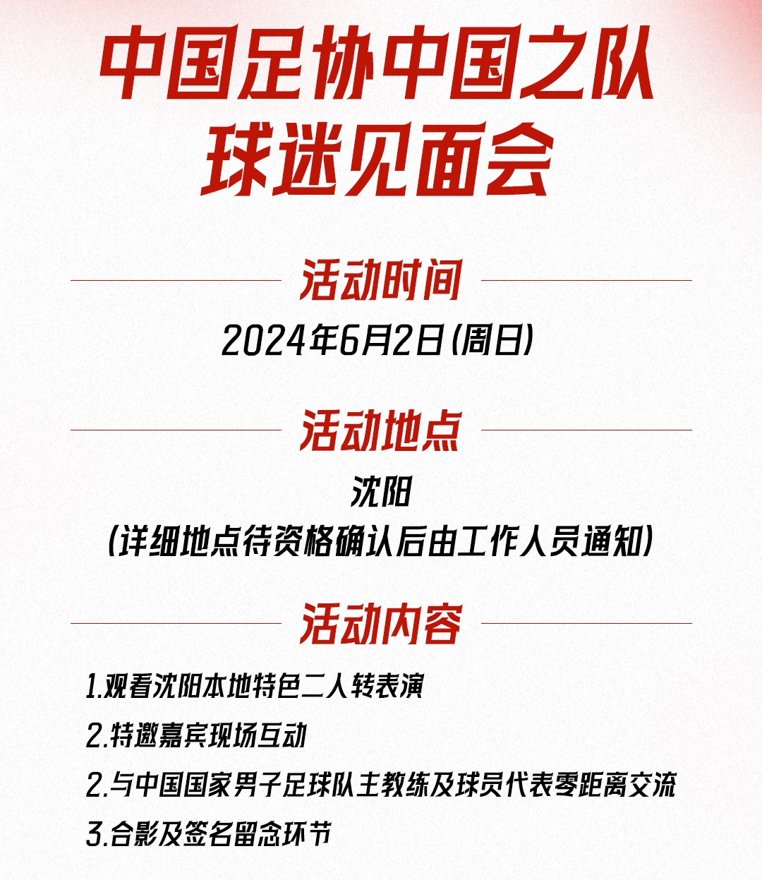 为感谢球迷热爱与支持,国足将于6月2日在沈阳举办球迷见面会