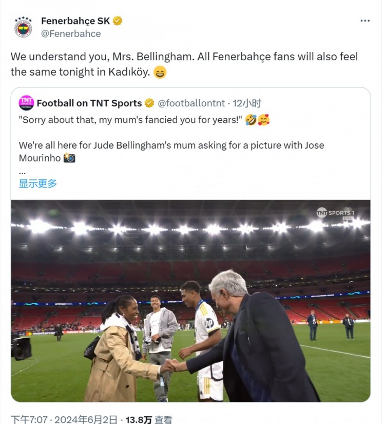 费内巴切转发了相关视频,并写道:“我们理解你,贝林厄姆夫人,所有的费内巴切球迷今晚会有同样的感受。”