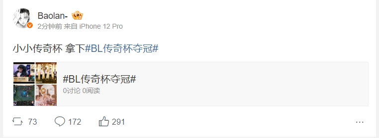 6月17日宣 传奇杯决赛Baolan队拒绝让二追三击败Ning队,赛后Baolan更博:小小传奇杯 拿下。