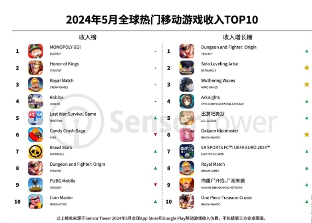 五月,众多新游戏在收入增长榜上名列前茅。由腾讯发行的《地下城与勇士:起源》在中国市场表现异常出色,仅用了10天就突破1亿美元的收入纪录,登顶收入增长榜,并在收入榜上位列第8名。