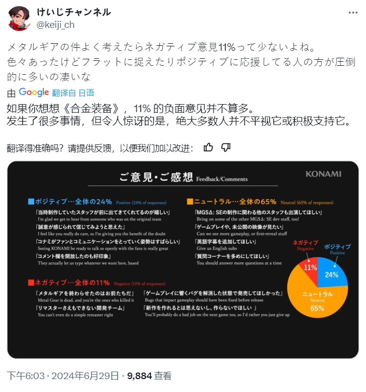 在负面反馈中,科乐美大胆地展示了一些尖锐的玩家评论,如“你们毁了《合金装备》”、“连重制版都做不好的开发团队”、“先解决游戏体验中的Bug再发布”以及“我不认为你们能做出新作,还不如不要开发”。