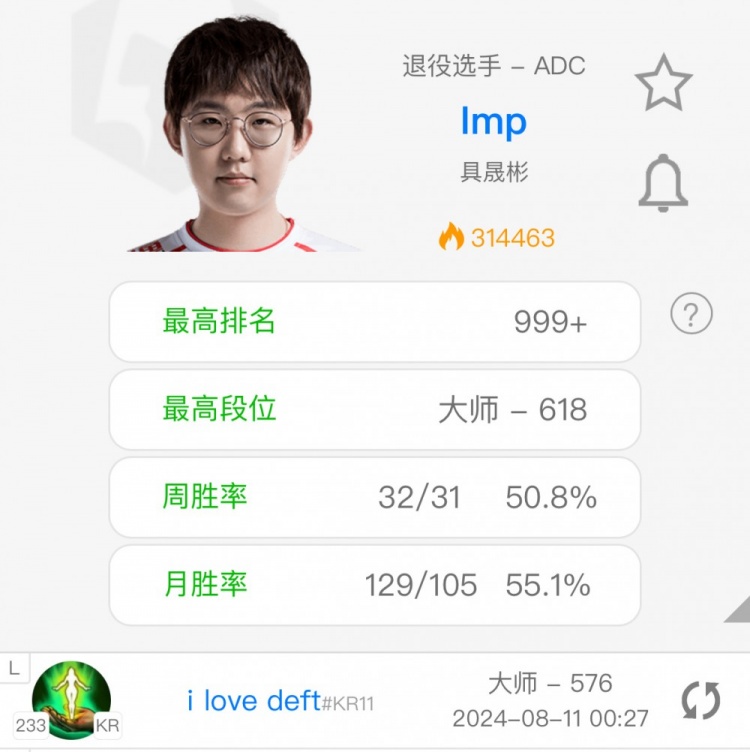 8月11日宣 近日imp在参加电竞全明星时输掉比赛,被惩罚韩服ID改成“我爱你Deft”,目前imp已将ID改成-i love deft