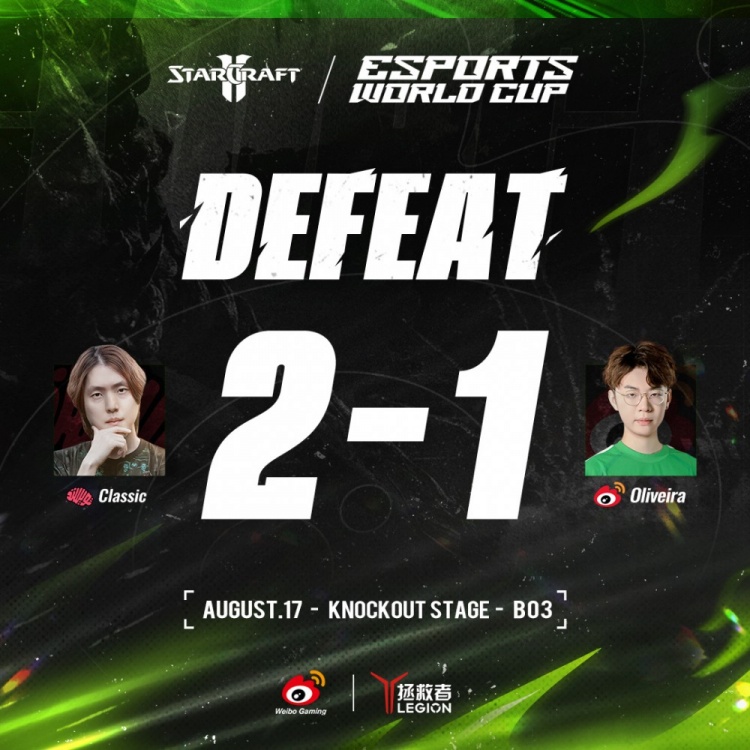 8月17日宣 在今天的EWC星际争霸2淘汰赛首场比赛中,Oliveira以1-2惜败于Classic,遗憾地结束了本次电竞世界杯的征程。期待他在未来的星际争霸2赛事中再创佳绩!