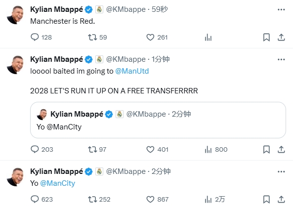 姆巴佩今早被盗号,在社媒疯狂发推。