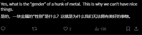 评论区网友纷纷表示无语“这世界疯了吧!”“纠结一块金属的性别,这就是为什么我们没法拥有美好的事物。”