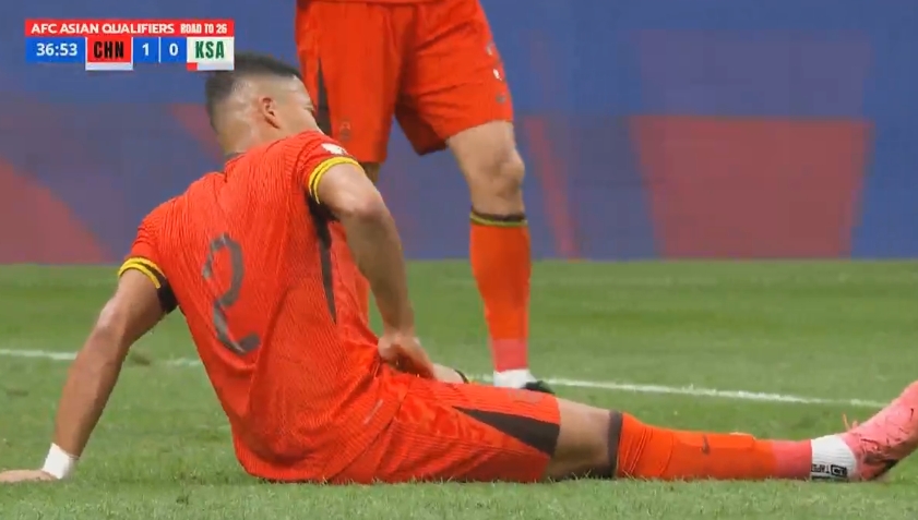 国足防线危第37分钟蒋光太倒地示意拉伤