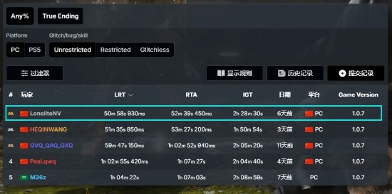 除此之外,在知名速通社区SpeedRun网站里,LonEliteNV创下的记录再次被收录,仍旧为榜单第一。