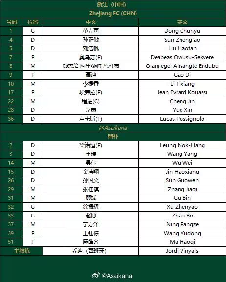 9月19日宣 北京时间20点,亚冠2级联赛F组,浙江客场挑战新加坡球队狮城水手,赛前双方公布首发。