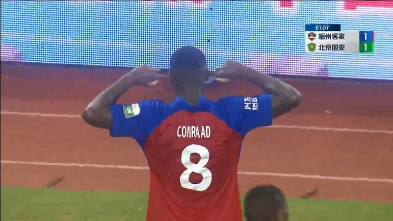 9月20日宣 中超第26轮,梅州客家vs北京国安。比赛第61分钟,梅州客家1-1扳平比分!茹子楠右路长驱直入给出直塞,罗德里格横传康拉德中路包抄推射轻松破门,VAR查看后确认进球有效。