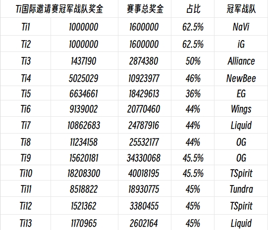 Ti13的冠军战队获得的赛事奖金为1170965美元,占比45%;历年国际邀请赛的赛事奖金如图: