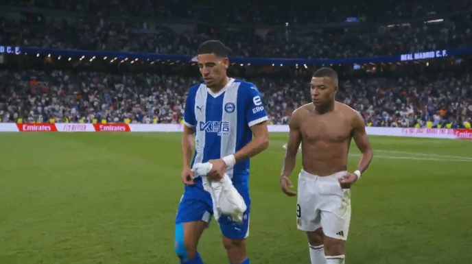 9月25日宣 西甲第7轮,皇马vs阿拉维斯。上半场结束,姆巴佩被阿拉维斯球员要走了球衣!