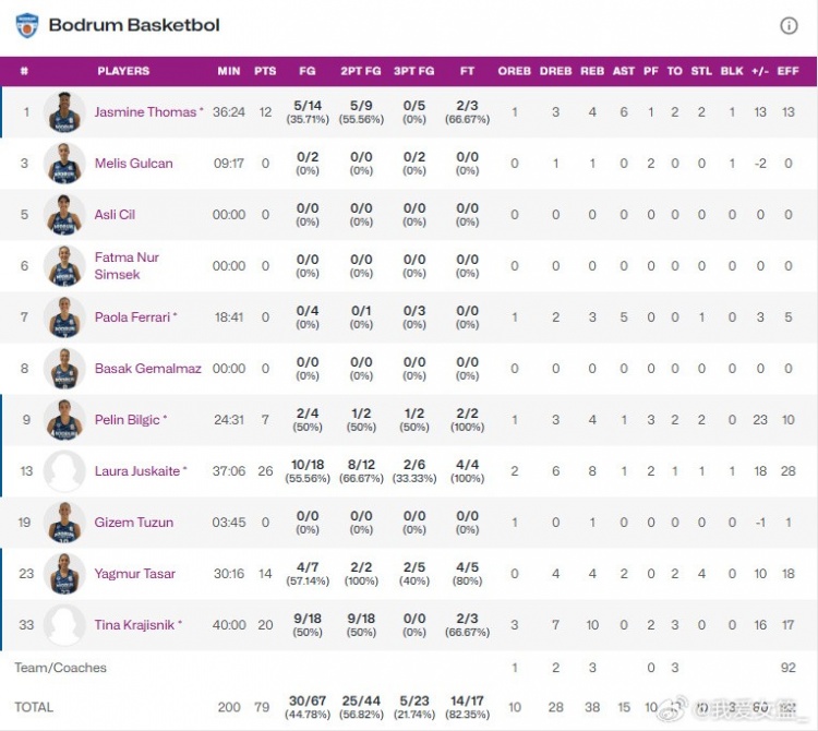 在刚刚结束的欧女杯比赛,博德鲁姆在内线核心李月汝轮休的情况下,以79-63在客场战胜斯洛伐克球队皮耶什坦斯克女篮。博德鲁姆队的劳拉-尤斯凯特砍下全场最高26分。