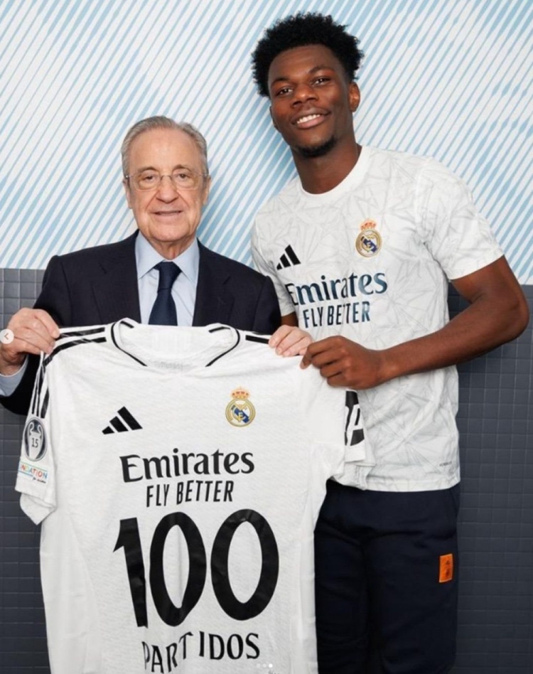 赛后,皇马主席弗洛伦蒂诺向琼阿梅尼赠送了百场纪念球衣,后者更新社媒,并配文道:“感谢马德里主义者。”