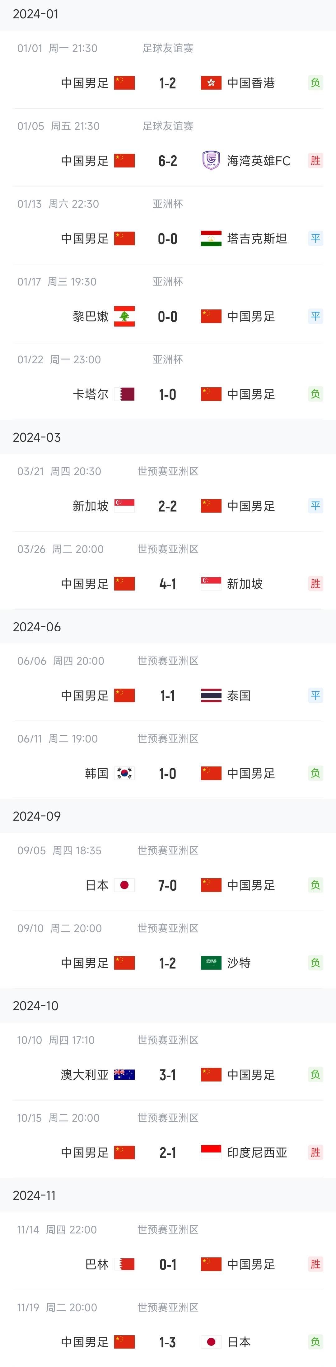 2024年的国家队比赛已经结束,来看看国足的战绩如何。