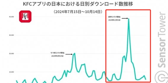 此外,日本肯德基 App 在 10 月 2 日缔造的下载次数,是自2021 年 10/16~ 2024 年 10/15 过去 3 年以来的最高纪录。