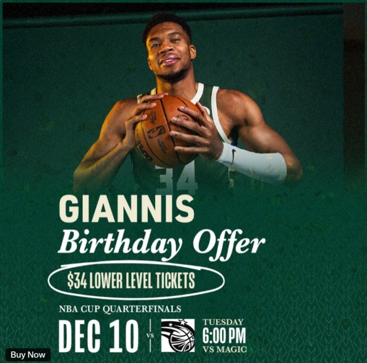 雄鹿官方宣布,为庆祝字母哥的30岁生日,观战12月11日在雄鹿主场迎战魔术的NBA杯1/4淘汰赛,下层看台票价仅需34美元(打折前约60美元),上层看台票价仅需20美元。