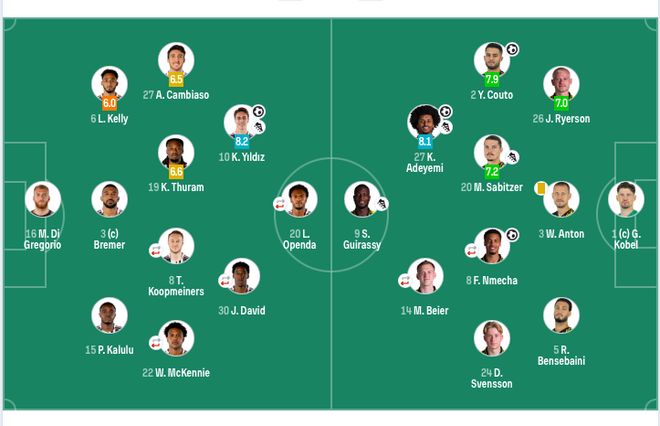 尤文图斯首发:16-迪格雷戈里奥、22-麦肯尼(60’25-马里奥)、3-布雷默、6-凯利、15-卡卢卢、8-库普梅纳斯(71’17-阿季奇)、19-凯夫伦·图拉姆、27-坎比亚索、10-伊尔迪兹、30-戴维(60’9-弗拉霍维奇)、20-奥蓬达(69’5-洛卡特利)。