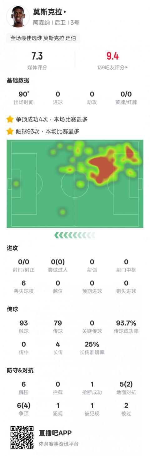 直播吧9月17日宣 欧冠联赛阶段第1轮,阿森纳客场2-0毕尔巴鄂竞技。莫斯克拉首发出战,93次触球全场最多,还有6次解围和4次争顶成功,评分7.3。