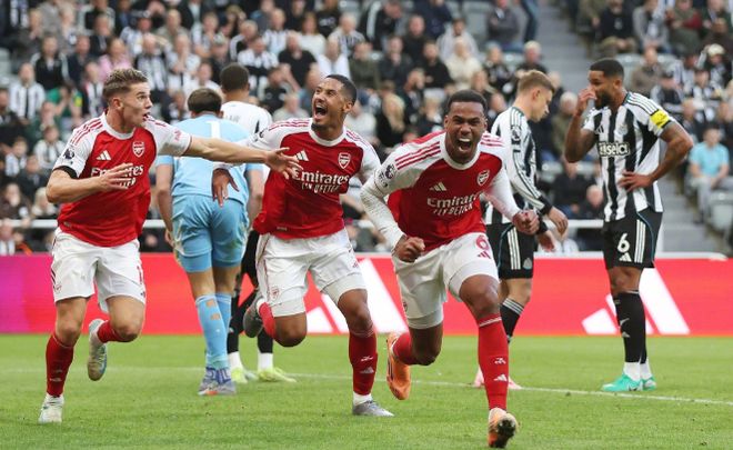 比赛进入补时阶段,高潮也随之而来;第96分钟,厄德高开出角球,加布里埃尔抢在波普之前高高跃起冲顶头球上演绝杀好戏,2:1!凭借这粒进球,枪手2:1逆转,排名上升到第2;距离榜首的利物浦只有2分。
