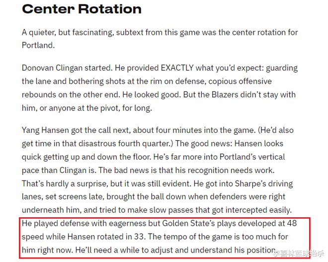 杨瀚森在首场季前赛表现不佳,他出战21分钟,5投2中,得到4分4篮板1助攻,出现4次失误和6次犯规。开拓者跟队记者戴夫·戴卡德撰文解析了开拓者的首场季前赛,其中包括中锋轮换的片段,他指出杨瀚森跑动速度其实并不慢,但是他的意识偏慢,也就是他的场上意识暂时还跟不上快节奏的NBA比赛。