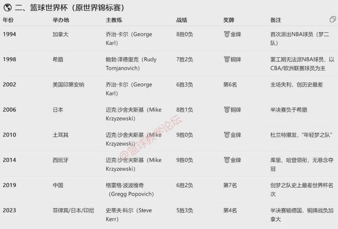 教主做了两个表格:自1992年至今,美国男篮历届奥运会和世界杯的主教练。老K教练无疑是最大赢家,率领美国男篮夺得三届奥运会金牌和两届篮球世界杯金牌。唯一的失利是2006年男篮世界杯,半决赛不敌希腊,最终夺得第三名。
