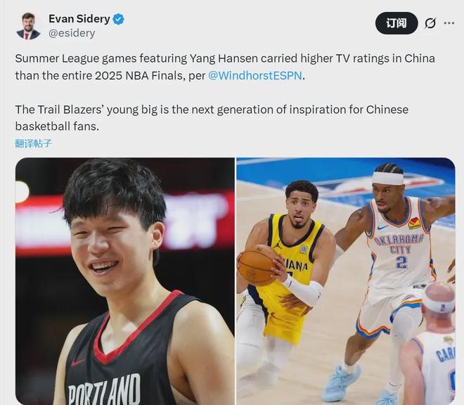 Reese Kunz写道:“尽管季前赛收视率还未公布,但是杨瀚森已经引发极高的关注度。杨瀚森参加的夏季联赛在中国的电视收视率,已经超过2025年NBA总决赛。如果他能成为明星球员,那整个NBA联盟和开拓者的关注度都将迎来爆发式增长。”