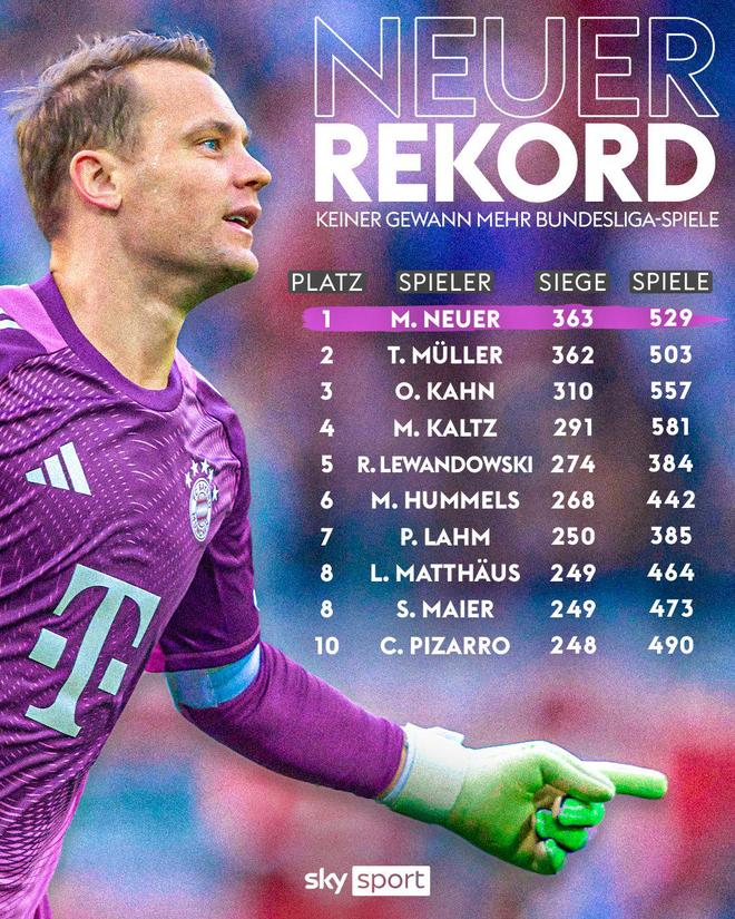 自诺伊尔2005年正式开启一线队职业生涯至今,共代表沙尔克04和拜仁慕尼黑出战了529场德甲联赛,取得了其中363场胜利。超越了老队友托马斯·穆勒(503场362胜)的纪录,加冕成为德甲历史胜场最多的球员。