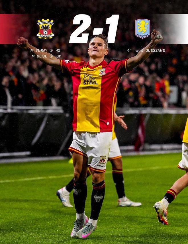 本轮欧联最大冷门来自荷兰的前进之鹰,全队总身价仅仅只有区区3110万欧元,却在主场2-1掀翻身价高达5.46亿欧元的英超劲旅阿斯顿维拉。