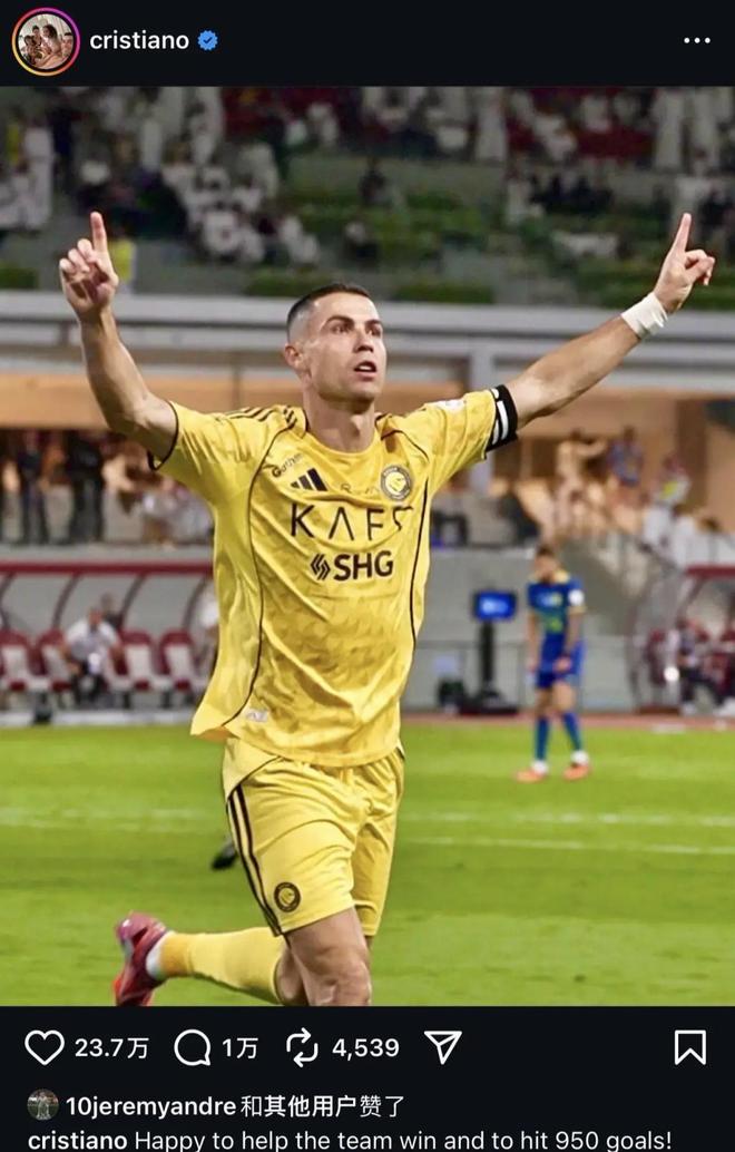 10月26日,沙特联赛第6轮,利雅得胜利客场2比0击败哈森姆,C罗打入一球,至此他的职业生涯进球数来到950球。