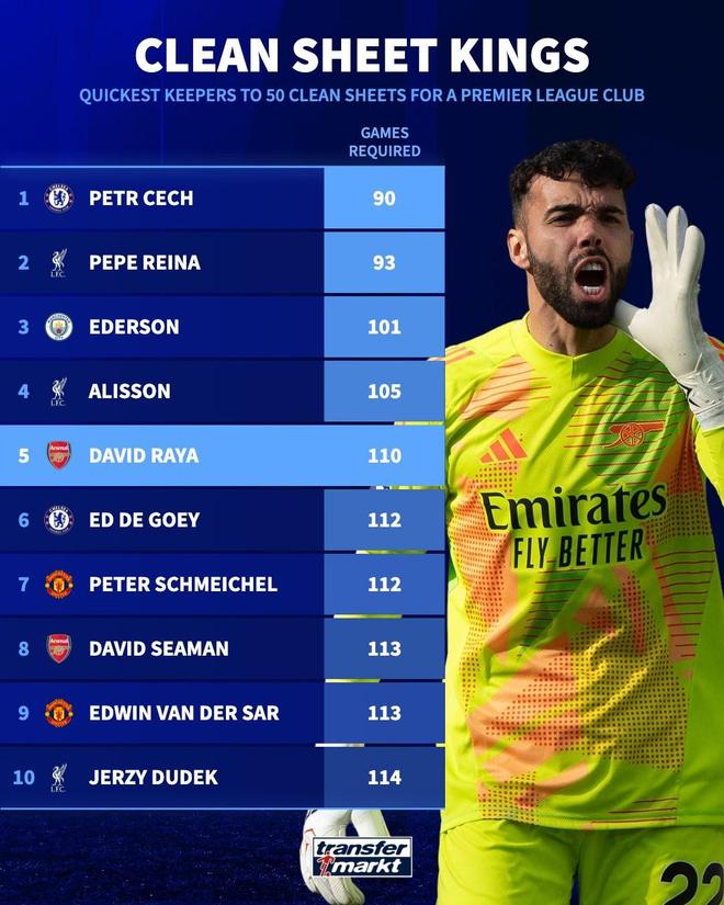 英超俱乐部最快达成50场零封门将前10:切赫第1,拉亚第5