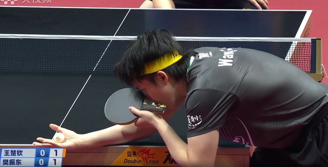后面被王楚钦连续两个倒地爆冲(上台一个被防回去一个)之后,樊振东变了一个长球,又被王楚钦直接侧身得分。