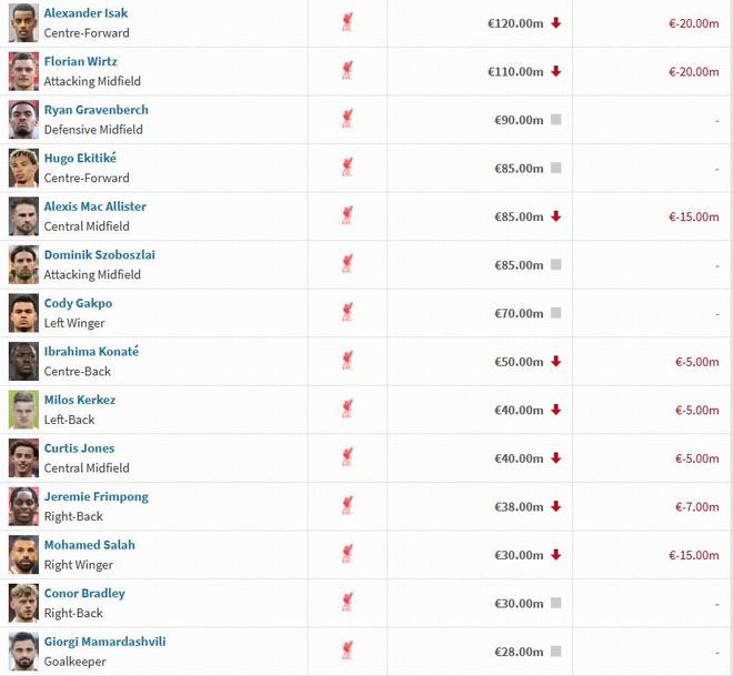 - 英超 | 利物浦球员身价变动:伊萨克维尔茨下跌2000万欧,萨拉赫下跌1500万欧