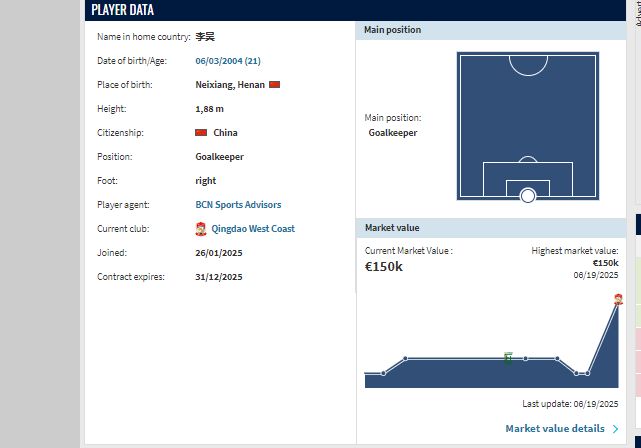 李昊现今21岁,司职门将,国青主力,曾留洋马德里竞技。25赛季,他效力于青岛西海岸,出场29次,完成8次零封,84次扑救,14次出击,这三项数据均中超前五水平。