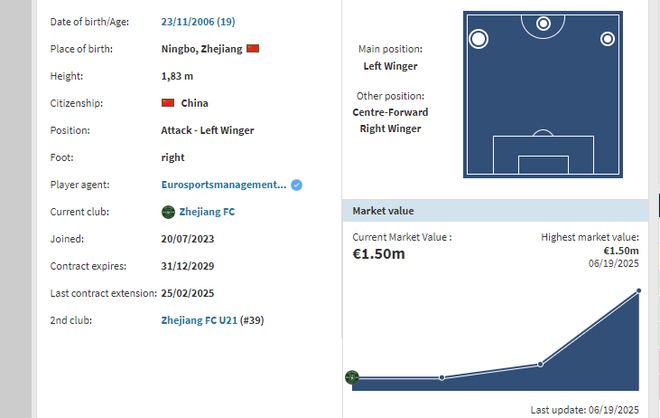 目前,李昊德转身价为15万欧,预估会涨到25万欧左右。