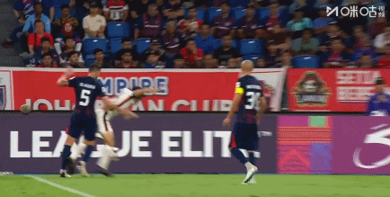 第15分钟,场上出现了惊险一幕——李圣龙在拼抢中倒地,柔佛后卫格劳德尔球鞋底部直接蹬踹到李圣龙面部,导致其血流满面。令人意外的是,主裁判未做任何判罚,VAR系统也未介入提醒,李圣龙经队医紧急处理后带伤出战。这一争议判罚不仅引发海港替补席不满,也成为本场比赛的争议点之一。