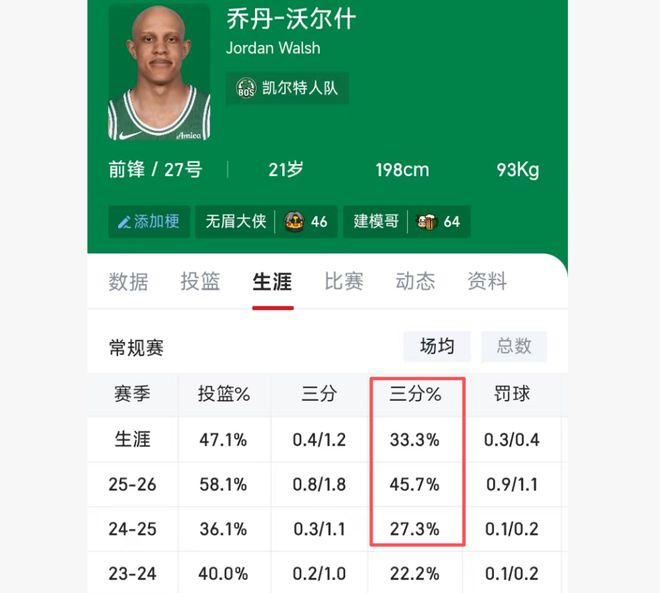 很多球迷并不了解这位“无眉大侠”,沃尔什虽然只有21岁却并非菜鸟,本赛季是他进入NBA的第三季,早在2023-24赛季19岁的沃尔什就已经是绿军一员。23-24赛季是绿军拿下第18个冠军的载入史册一季,那年季后赛沃尔什只出战3场比赛,场均3.7分钟是名副其实的饮水机管理员,没人注意到他的存在。