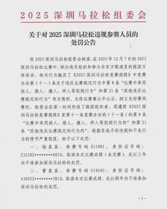 为保证赛事公平公正、树立良好赛风赛纪,组委会在第一时间约谈了跑团组织者,现遵照《2025深圳马拉松竞赛规程》里第十一条竞赛办法的(十一条)的第8条“比赛中采用挤人、推人、撞人、绊人等犯规行为的”和第21条“其他违反比赛规定的行为的”,根据各选手的违规和不良行为的情节严重程度,给予以下处罚: