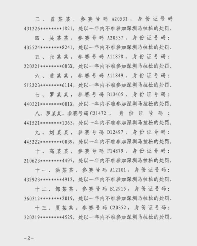 十一、洪某某,参赛号码A12101,身份证号码:432923********4912,处以一年内不准参加深圳马拉松的处罚。