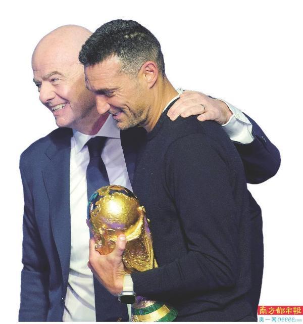 12月6日,美加墨世界杯抽签仪式现场,阿根廷队主教练斯卡洛尼(左)送还大力神杯。