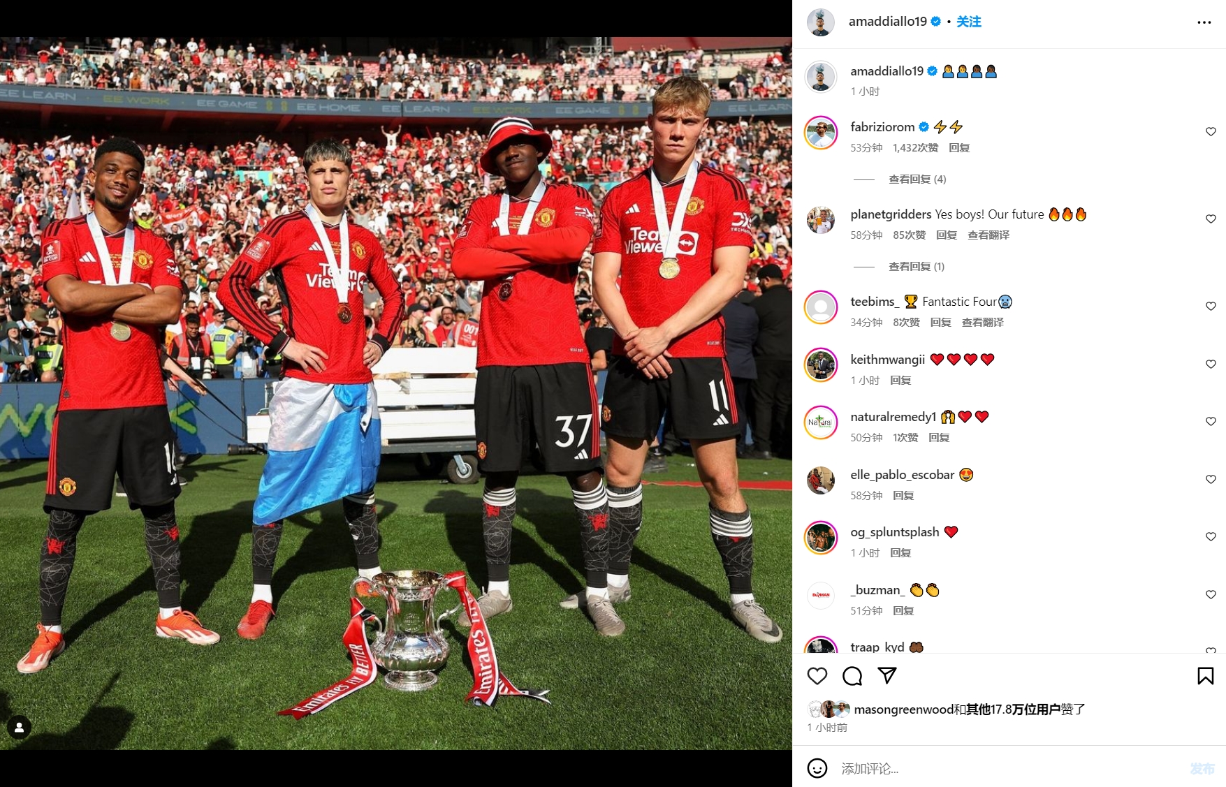 5月26日宣 本赛季足总杯决赛,曼联2-1曼城时隔八年再次夺冠。赛后21岁的迪亚洛晒出了自己与19岁加纳乔、19岁梅努、21岁霍伊伦的四人夺冠合影。