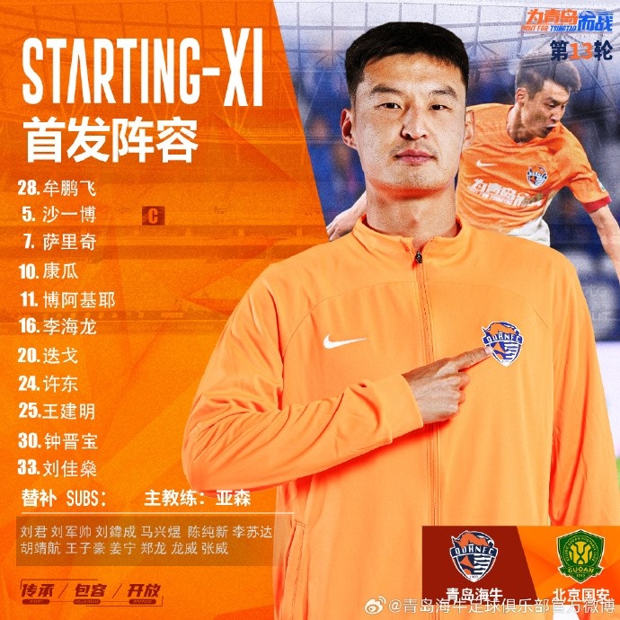 09月15日宣 今晚19点,中超第25轮,青岛海牛vs武汉三镇,赛前双方首发出炉。青岛海牛首发:28-牟鹏飞、5-沙一博、24-许东、25-王建明、26-尼古拉(F)、33-刘佳燊、7-萨里奇(F)、20-迭戈(F
